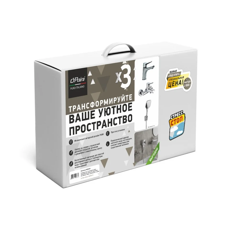 Комплект смесителей Paini Messina 3в1, для раковины и ванны с душевым набором, MECRSET3, хром
