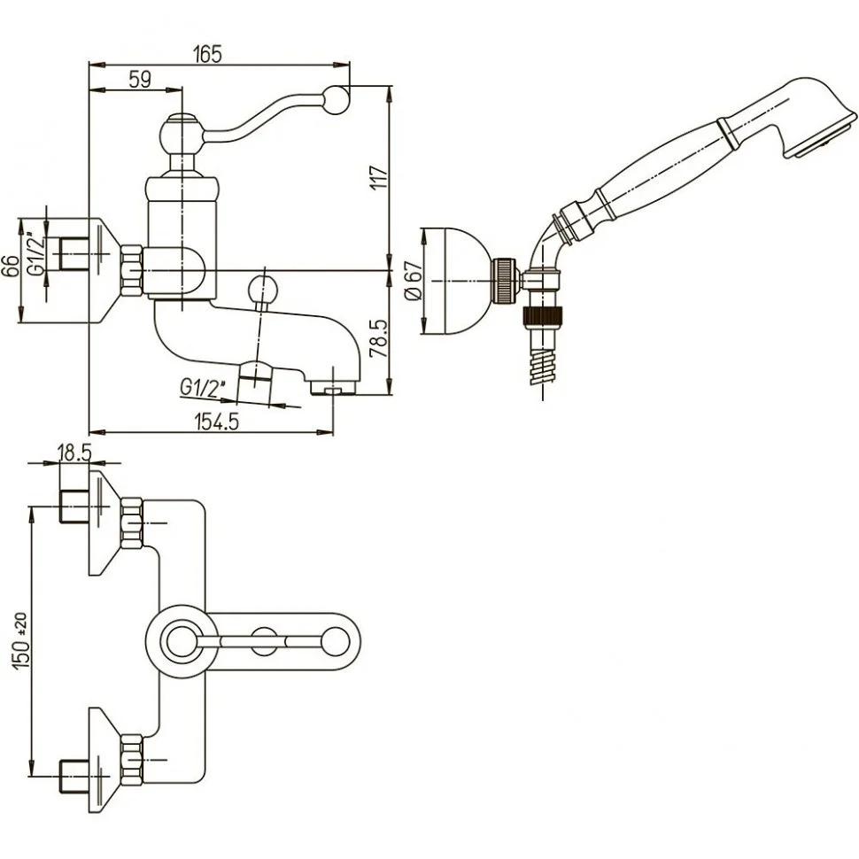 В комплект входит смеситель для раковины (за счет высоты чуть выше средней может отлично размещаться на раковины различных размеров), смеситель для ванны и регулируемый по высоте стальной душевой гарнитур с 5-ти режимной лейкой и полочкой.