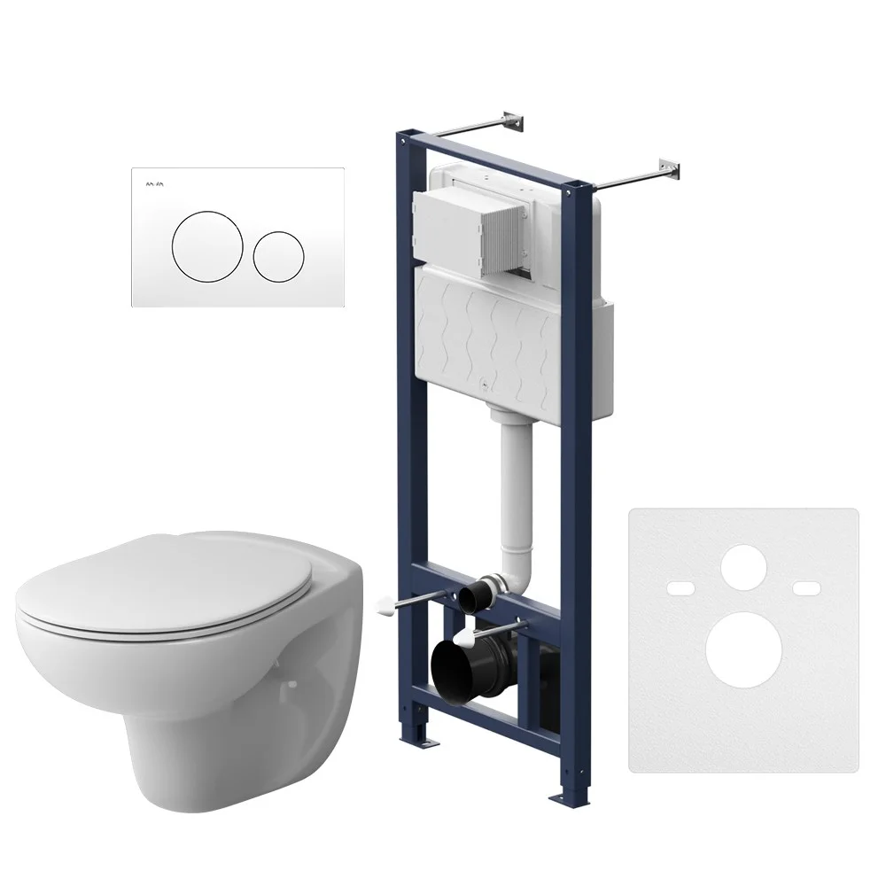 Полностью готовый к установке комплект: система инсталляции с клавишей подвесной унитаз с сиденьем. Неразборная рама из стального профиля выдерживает нагрузку до 400 кг. Полностью изолированный бачок с качественной двухрежимной смывной арматурой - комфортное использование благодаря низкому уровню шума - менее 20 Дб. Укомплектован пневматической клавишей в белом цвете. В комплекте все необходимые патрубки и крепления а также прокладка между унитазом и стеной - звукоизоляция.