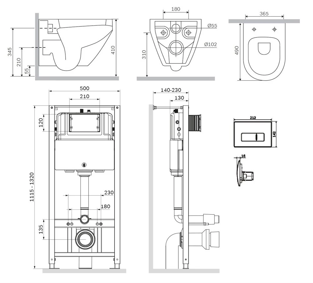 Полностью готовый к установке комплект: система инсталляции с клавишей подвесной унитаз сиденьем.