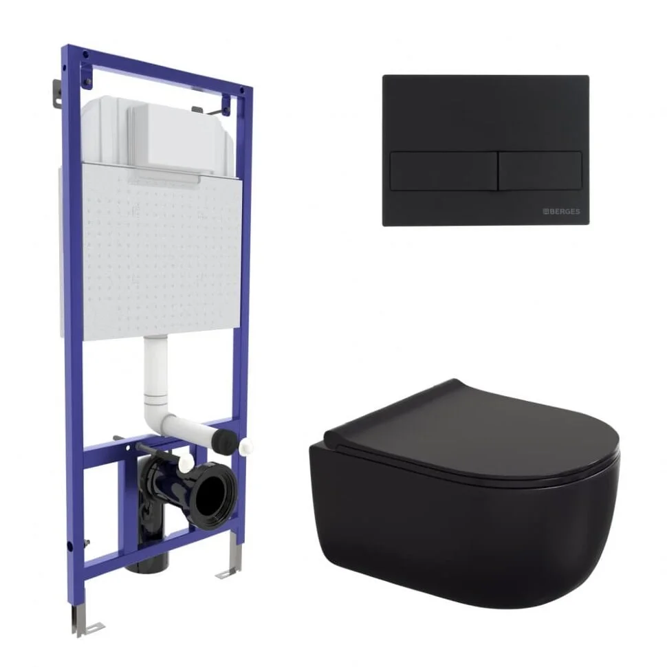 Полный комплект BERGES для монтажа подвесного унитаза: узкая инсталляция NOVUM525: толщина бачка 80мм, смыв 3/7 литра, нагрузка 400 кг, антикоррозийное покрытие, кнопка L5 черный матовый,унитаз EGO Black Rimless, сидение дюропласт Toma Black Slim SO, микролифт, быстросьем. Все крепежи для установки в комплекте. Возможность установки в угол.