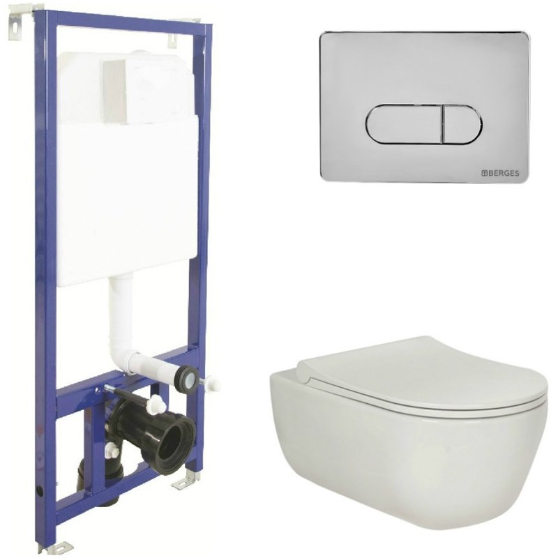 Полный комплект BERGES для монтажа подвесного унитаза: узкая инсталляция NOVUM525: толщина бачка 80мм, смыв 3/7 литра, нагрузка 400 кг, антикоррозийное покрытие, кнопка D3 хром глянец, гальваника,унитаз EGO XL Rimless, сидение дюропласт Toma Slim SO, микролифт, быстросьем. Все крепежи для установки в комплекте. Возможность установки в угол.