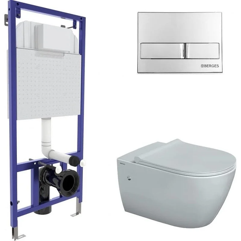 Полный комплект BERGES для монтажа подвесного унитаза: узкая инсталляция NOVUM525: толщина бачка 80мм, смыв 3/7 литра, нагрузка 400 кг, антикоррозийное покрытие, кнопка L3 хром глянец, унитаз MASCON Rimless 57 см, сиденье дюропласт Toma Slim SO. Все крепежи для установки в комплекте. Возможность установки в угол.