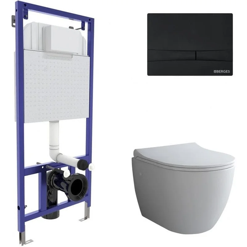Полный комплект BERGES для монтажа подвесного унитаза: узкая инсталляция NOVUM525: толщина бачка 80мм, смыв 3/7 литра, нагрузка 400 кг, антикоррозийное покрытие, кнопка L5 черный матовый, унитаз OKUS 48 см, сиденье дюропласт Toma Slim SO. Все крепежи для установки в комплекте. Возможность установки в угол.