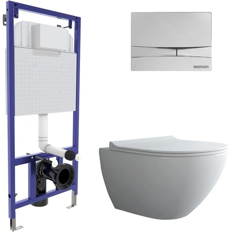 Полный комплект BERGES для монтажа подвесного унитаза: узкая инсталляция NOVUM525: толщина бачка 80мм, смыв 3/7 литра, нагрузка 400 кг, антикоррозийное покрытие, кнопка F3 хром глянец, унитаз PUMA Rimless 51 см, сиденье дюропласт Toma Slim SO. Все крепежи для установки в комплекте. Возможность установки в угол.