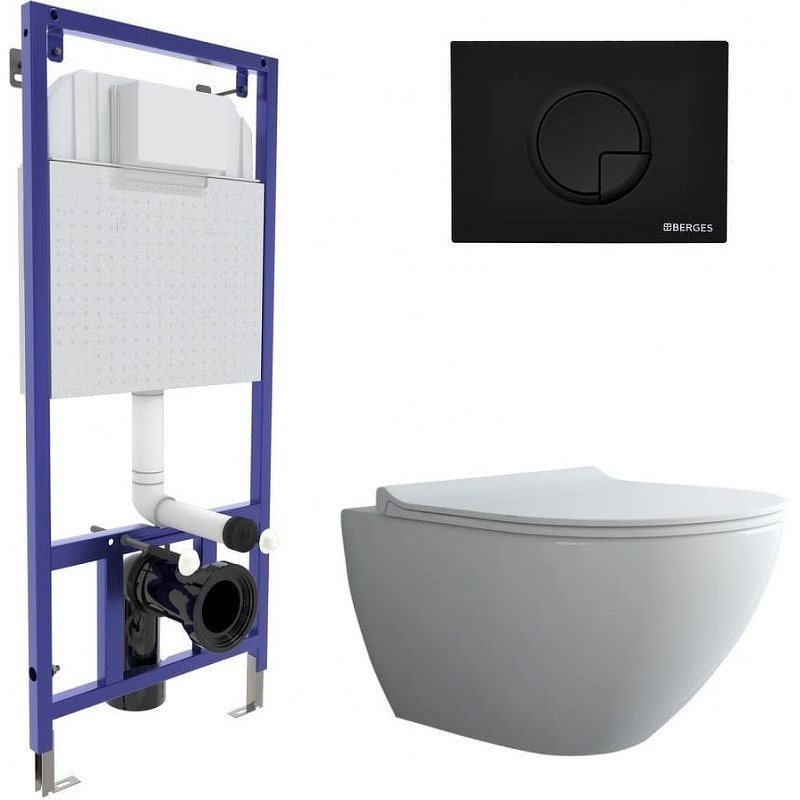 Полный комплект BERGES для монтажа подвесного унитаза: узкая инсталляция NOVUM525: толщина бачка 80мм, смыв 3/7 литра, нагрузка 400 кг, антикоррозийное покрытие, кнопка R5 черный матовый, унитаз PUMA Rimless 51 см, сиденье дюропласт Toma Slim SO. Все крепежи для установки в комплекте. Возможность установки в угол.