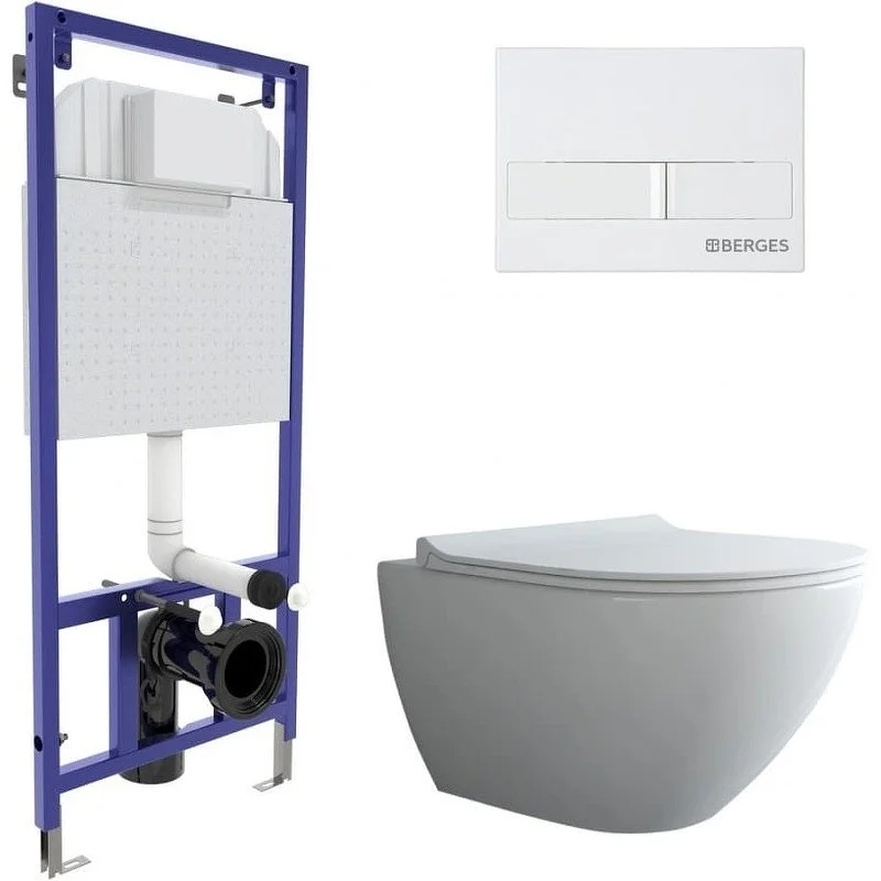 Полный комплект BERGES для монтажа подвесного унитаза: узкая инсталляция NOVUM525: толщина бачка 80мм, смыв 3/7 литра, нагрузка 400 кг, антикоррозийное покрытие, кнопка L1 белая, унитаз PUMA XL Rimless 55 см, сиденье дюропласт Toma Slim SO. Все крепежи для установки в комплекте. Возможность установки в угол.