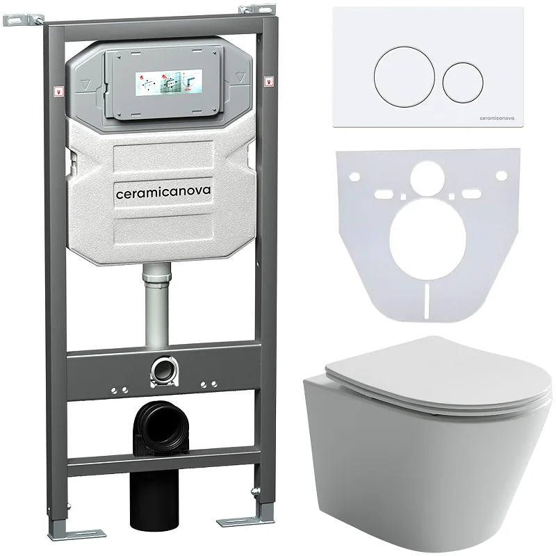 Комплект унитаза Ceramica Nova Balearica Rimless CN6000 c шумоизоляцией CN1000 инсталляцией Envision клавишей смыва Round белый и креплениями CN1001W
