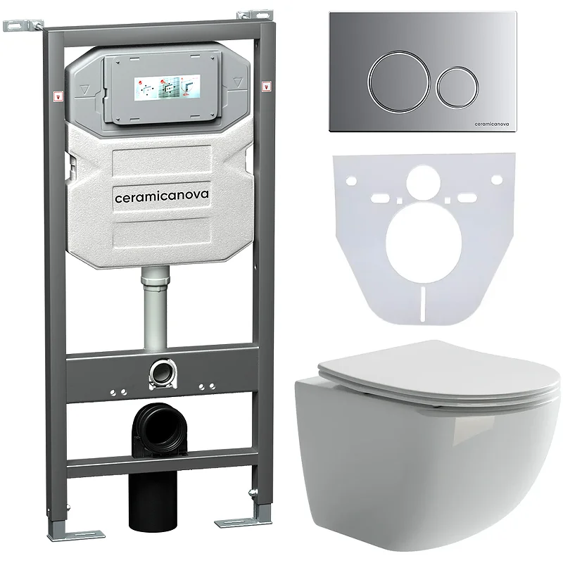 Комплект унитаза Ceramica Nova Forma Rimless CN3009 c шумоизоляцией CN1000 инсталляцией Envision клавишей смыва Round хром матовый и креплениями CN1001M
