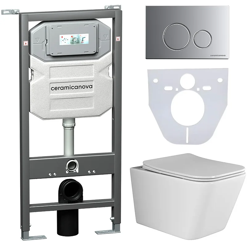 Комплект унитаза Ceramica Nova Metric Rimless CN3007 c шумоизоляцией CN1000 инсталляцией Envision клавишей смыва Round хром матовый и креплениями CN1001M