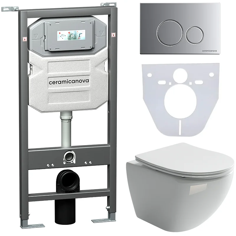 Комплект унитаза Ceramica Nova Metropol Rimless CN4002 c шумоизоляцией CN1000 инсталляцией Envision клавишей смыва Round хром матовый и креплениями CN1001M