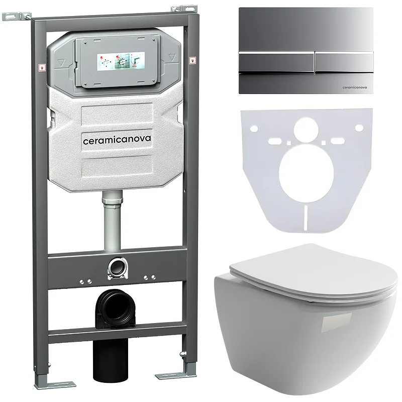 Комплект унитаза Ceramica Nova Metropol Rimless CN4002 c шумоизоляцией CN1000 инсталляцией Envision клавишей смыва Flat хром матовый и креплениями CN1002M
