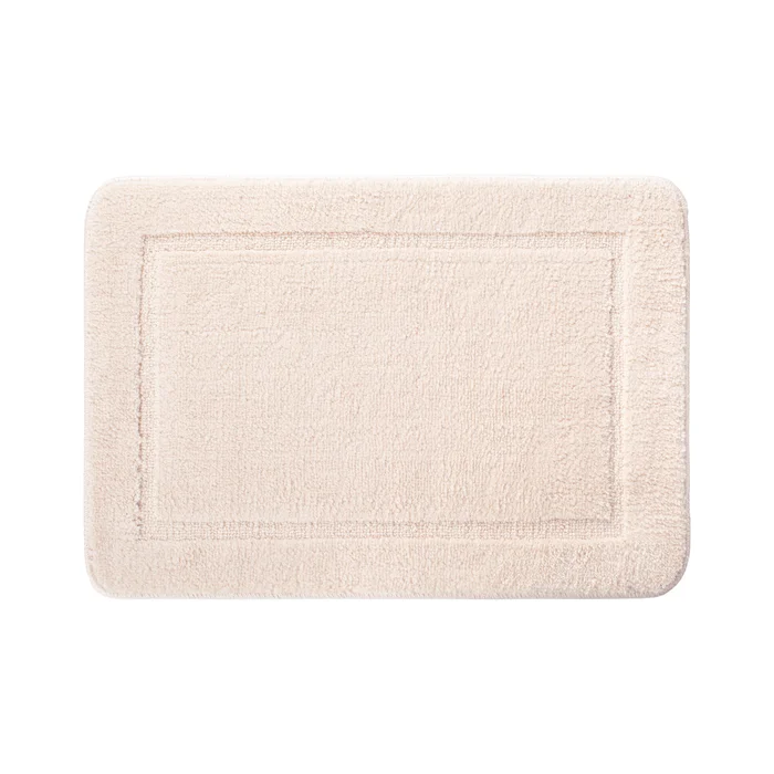 Мягкий коврик для ванной светло-бежевого цвета с плотным невысоким ворсом (1 см), очень приятный на ощупь. Ворс из микрофибры отлично держит форму, легко чистится и быстро сохнет.