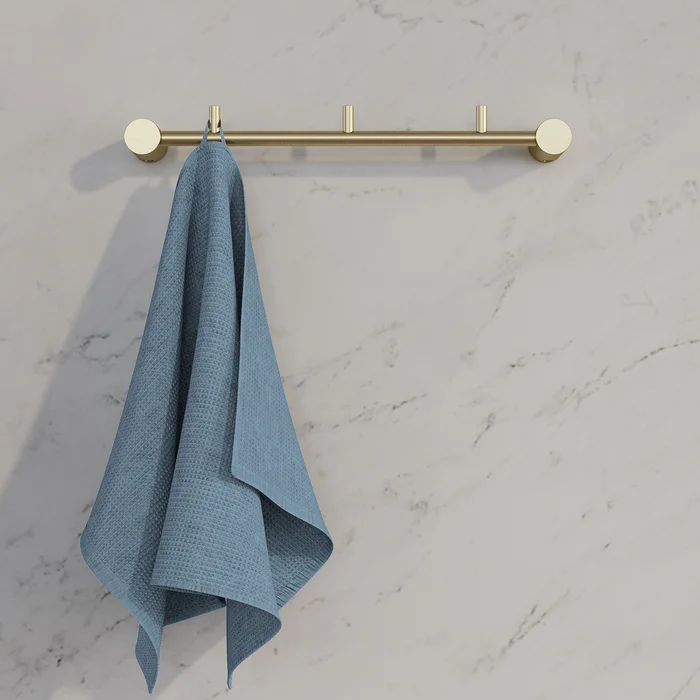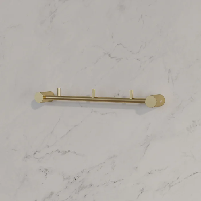 Планка с тремя крючками Petite в матовом золотом цвете позволит с комфортом разместить несколько банных полотенец и халатов, дополнив места для хранения в ванной.