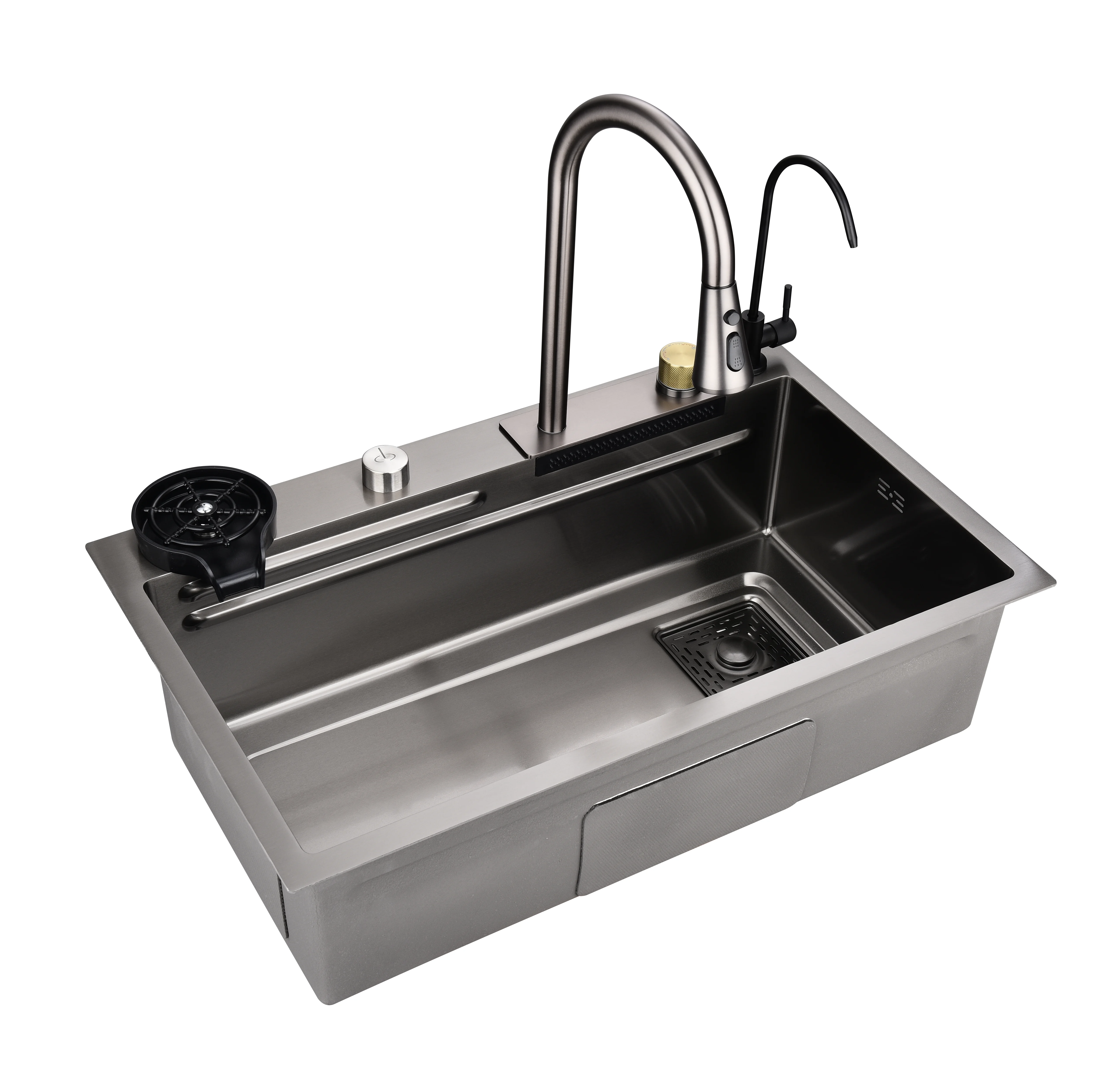 водопадный излив, вытягивающийся излив, заглушка слива, ополаскиватель для стаканов, кран для чистой воды, коландер, разделочная доска