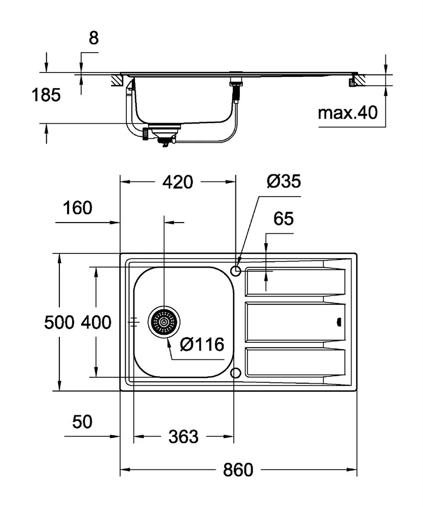 - требуемый размер отверстия в столешнице для установки мойки: 840 x 480 мм