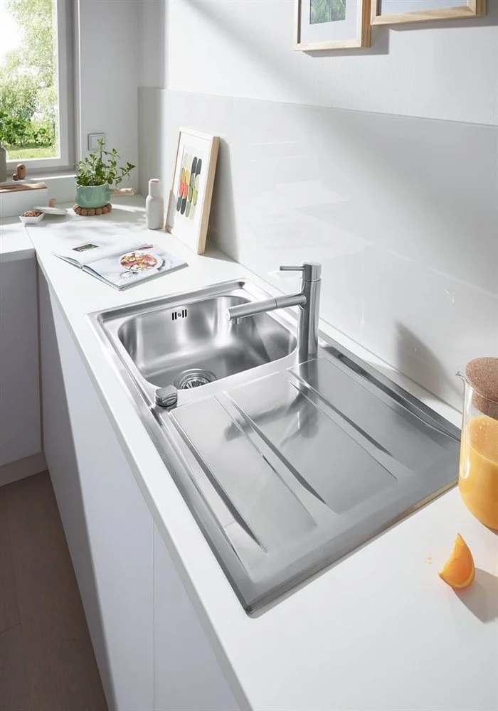 Мойка GROHE K400+ из нержавеющей стали - очень прочная, надежная и практичная мойка, которая справится с любой задачей. Мойка имеет два подготовленных под смеситель отверстия, что делает ее полностью оборачиваемой. Плоский монтаж обеспечивает бесшовную посадку с рабочими поверхностями. Мойка предлагает большое внутреннее пространство, а глубина чаши составляет 18.5 см, что означает, что вы с легкостью сможете наполнять даже большие емкости. Мойка оснащена рядом умных характеристик: например, изоляция GROHE Whisper на нижней части мойки уменьшает шум, а автоматический мусоросборник с дистанционным управлением подразумевает, что вы можете вытащить пробку, не опуская свою руку в грязную воду. Мойка изготовлена из ультра прочной нержавеющей стали AISI 304, которую порой называют "marine steel". Она устойчива к ржавчине, коррозии, кислотам и хлору. Благодаря системе быстрого монтажа GROHE QuickFix установка мойки н