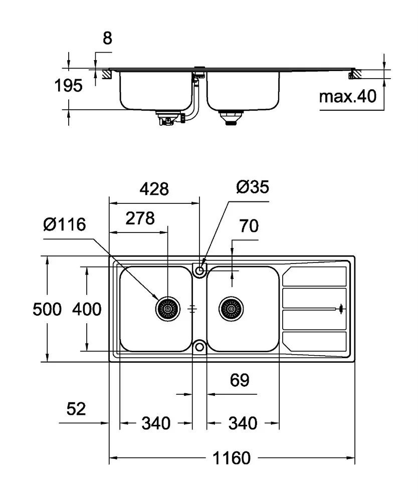 Мойка Grohe K500 из нержавеющей стали с корзинчатым вентилем, 31588SD0, левая/правая