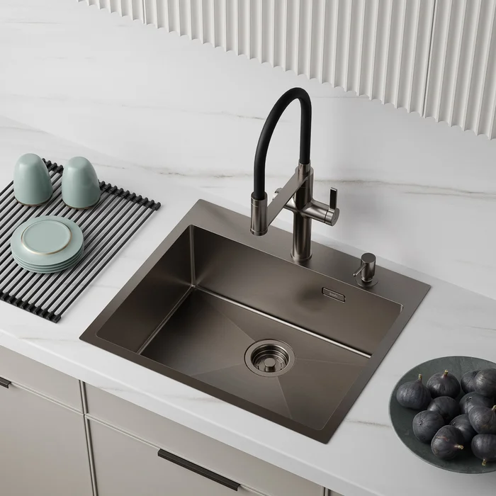 • Красивый и стойкий графитовый цвет достигается путем обработки мойки парообразным металлом: частички краски проникают в структуру стали и образуют микрослой (PVD-покрытие) на поверхности.