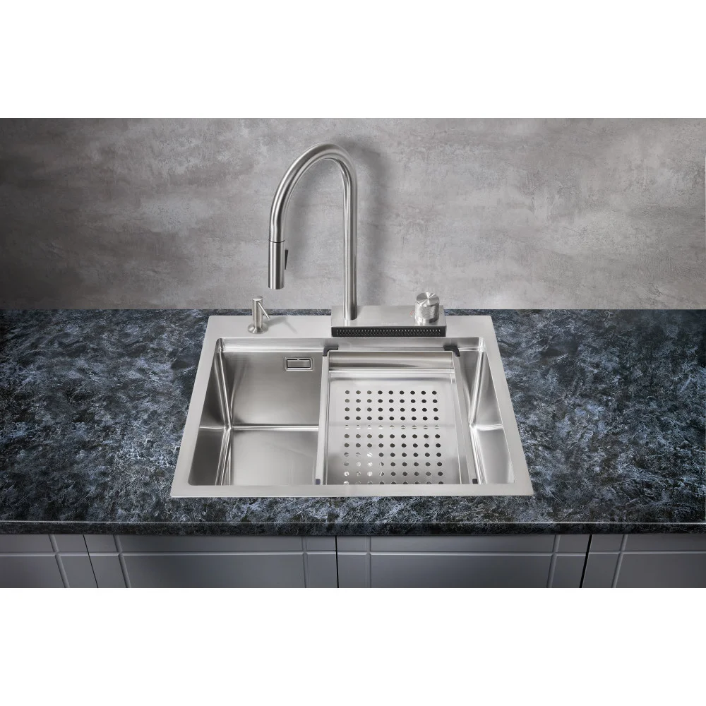 Кухонная мойка - 1шт., Сливная арматура - 1шт., Паспорт - 1 шт., Смеситель с горизонтальным душем - 1 шт., Коландер - 1 шт.