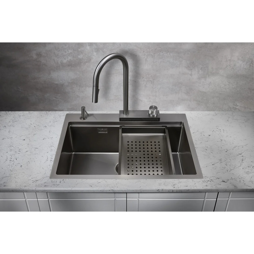 Кухонная мойка - 1шт., Сливная арматура - 1шт., Паспорт - 1 шт., Смеситель с горизонтальным душем - 1 шт., Коландер - 1 шт.