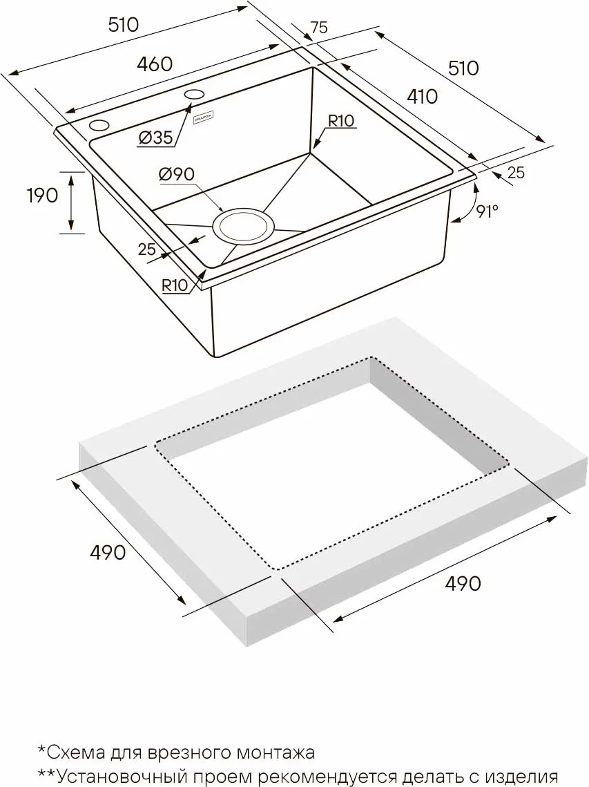 Комплект крепежей для врезного монтажа, Отводная арматура (слив-перелив), Сифон бутылочного типа с подключением посудомоечной машины (ПММ).