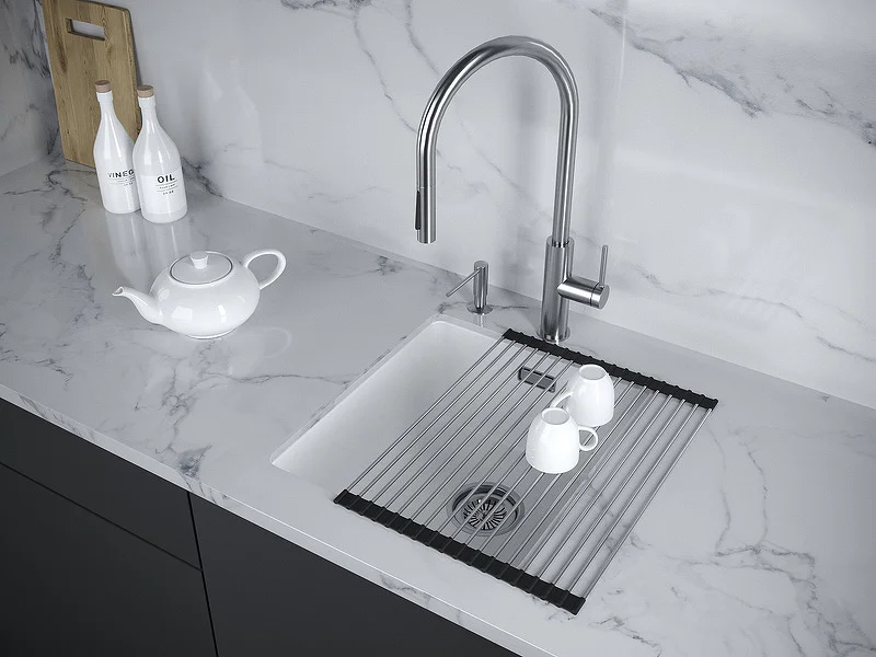 Декоративная накладка на слив в цвете брашированная нержавеющая сталь, Комплект крепежа для врезного и подстольного монтажа, Отводная арматура (слив-перелив), S-образный телескопический сифон с подключением посудомоечной машины (ПММ), Декоративная накладка на перелив.