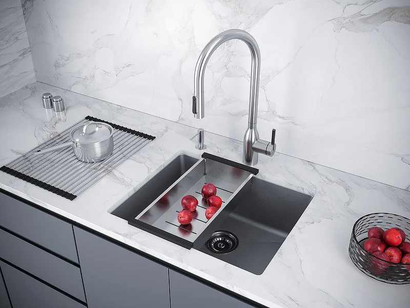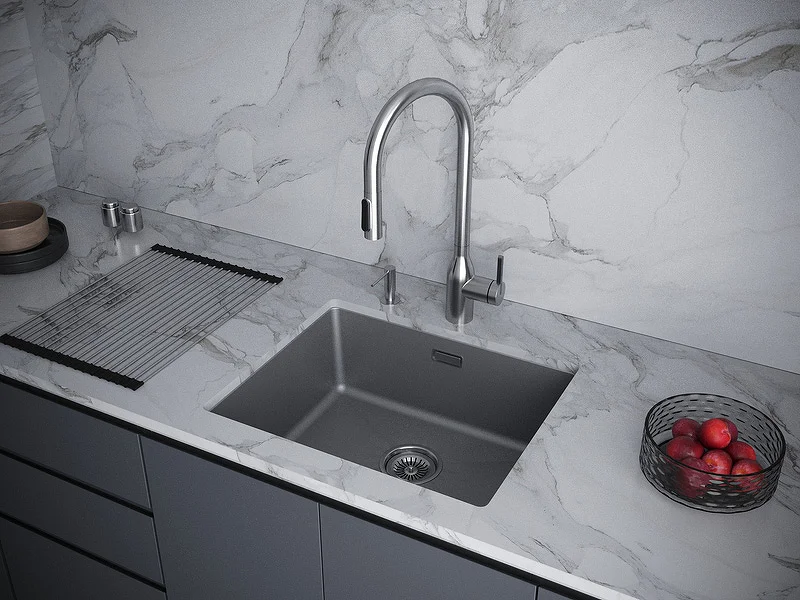 Декоративная накладка на слив в цвете брашированная нержавеющая сталь, Комплект крепежа для врезного и подстольного монтажа, Отводная арматура (слив-перелив), S-образный телескопический сифон с подключением посудомоечной машины (ПММ), Декоративная накладка на перелив.