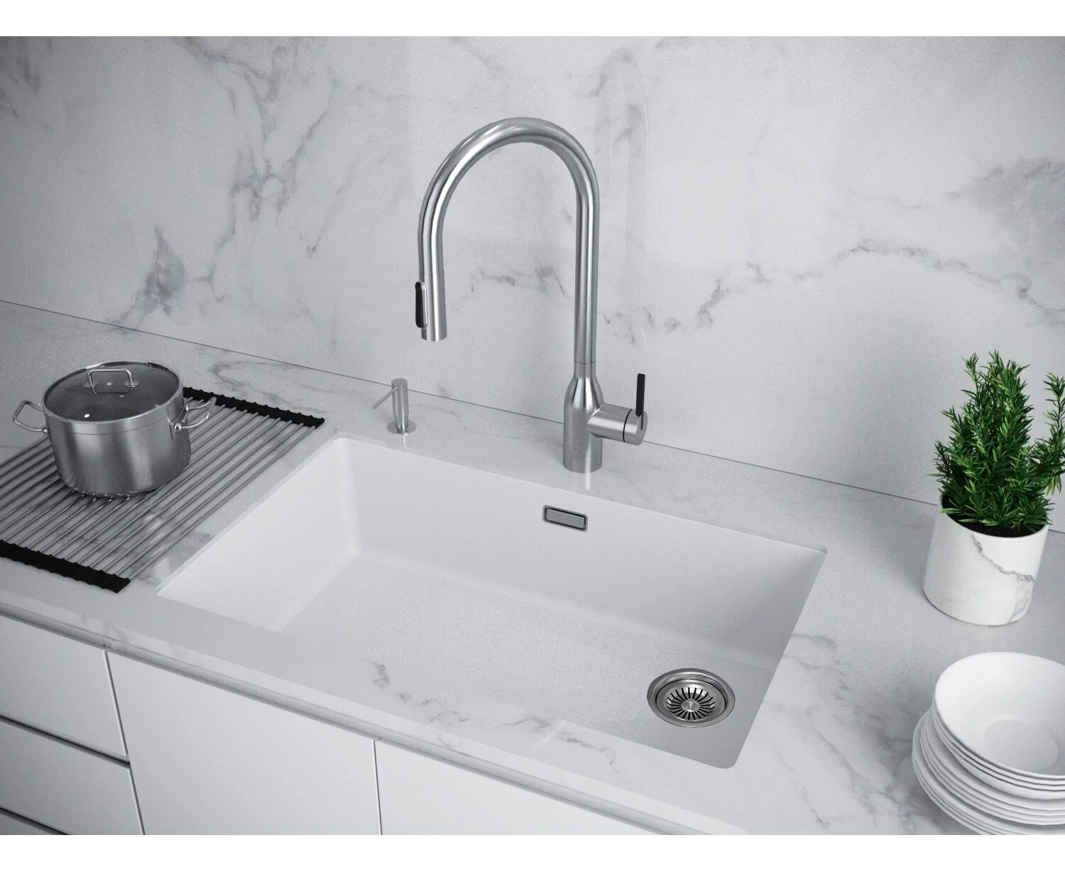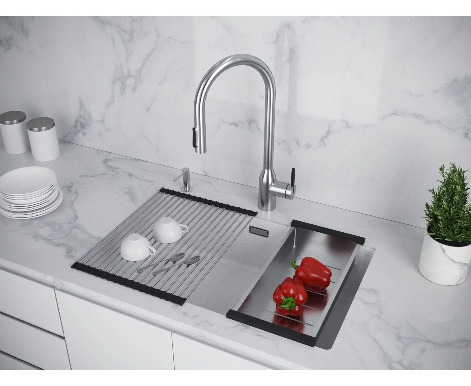 Декоративная накладка на слив в цвете брашированная нержавеющая сталь, Комплект крепежа для врезного и подстольного монтажа, Отводная арматура (слив-перелив), S-образный телескопический сифон с подключением посудомоечной машины (ПММ), Декоративная накладка на перелив.