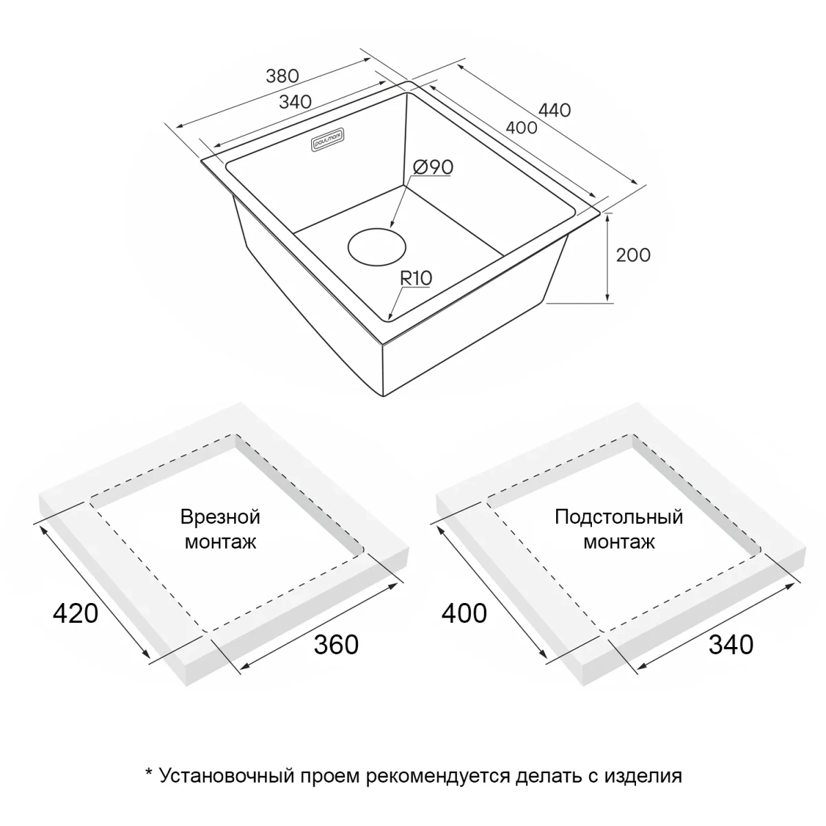 Комплект крепежей для врезного монтажа, Комплект для подстольного монтажа, Отводная арматура (слив-перелив), Сифон бутылочного типа с подключением посудомоечной машины (ПММ).
