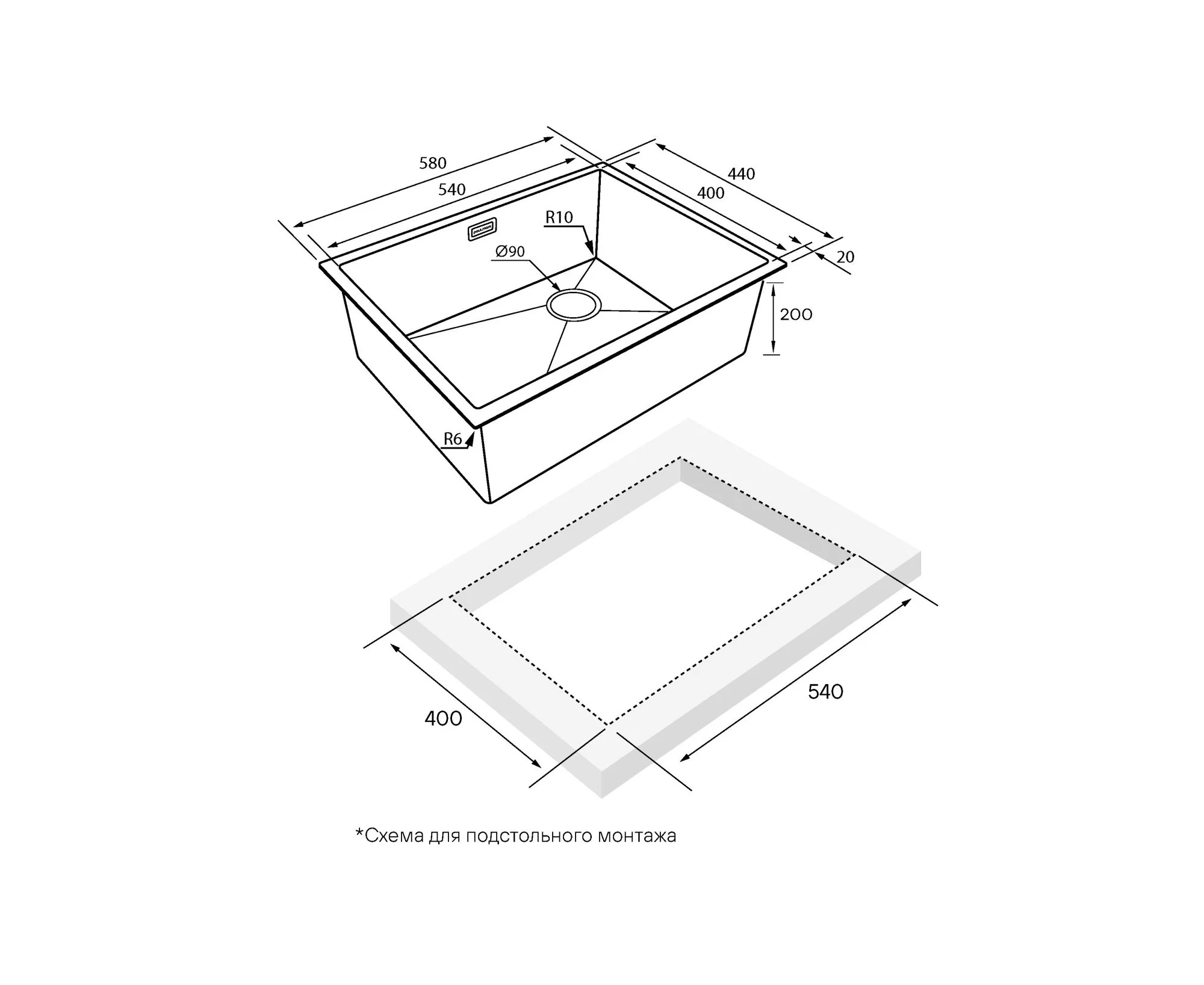 Комплект крепежей для подстольного монтажа, Комплект для врезного монтажа, Отводная арматура (слив-перелив), Декоративная накладная на сливное отверстие, Сифон бутылочного типа с подключением посудомоечной машины (ПММ).