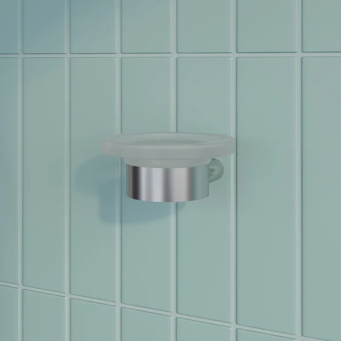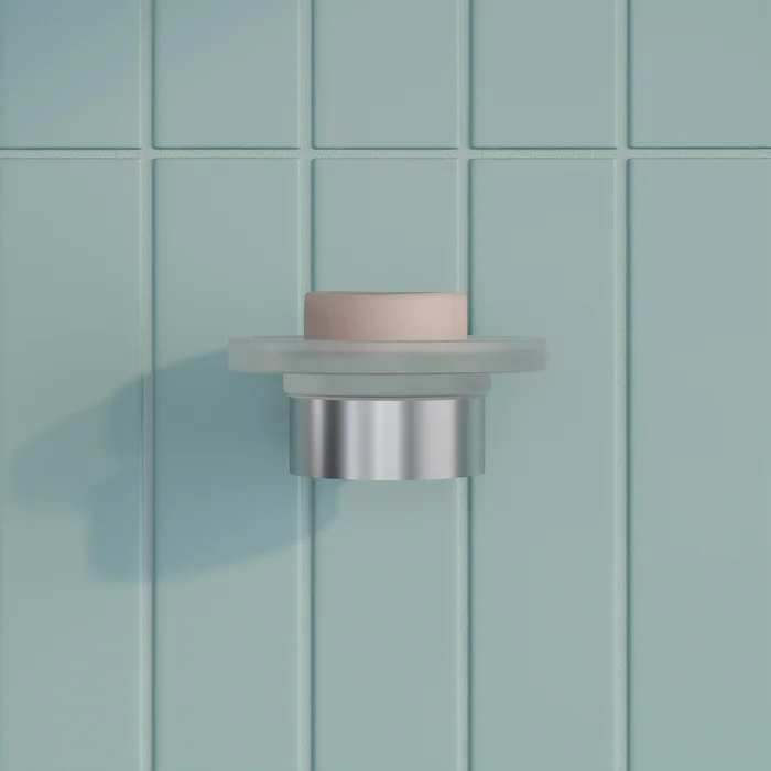 Мыльница из матового стекла легко вынимается из держателя, и ее просто промыть.