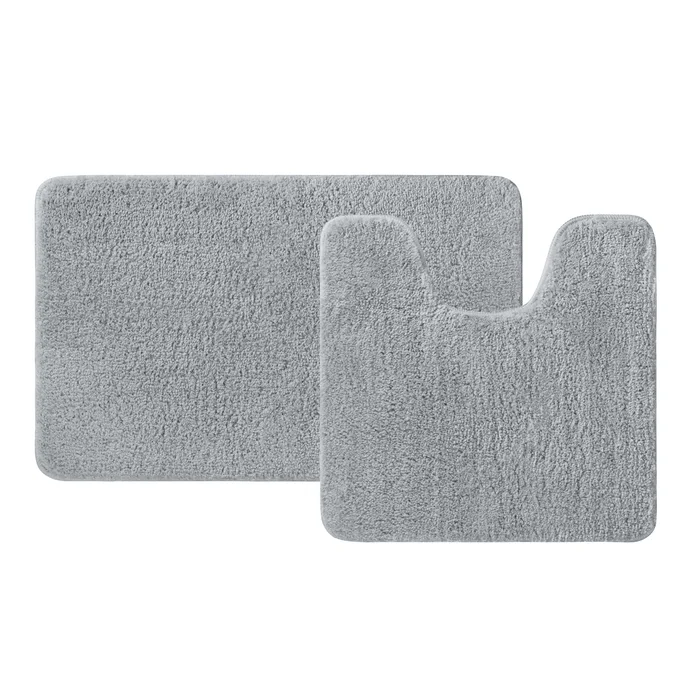 Набор из двух мягких ковриков для ванной серого цвета с плотным высоким ворсом (2 см), очень приятных на ощупь. Стриженый ворс из микрофибры отлично держит форму, легко чистится и быстро сохнет. Коврики предназначены для ванной и для туалета (маленький коврик имеет вырез под унитаз).