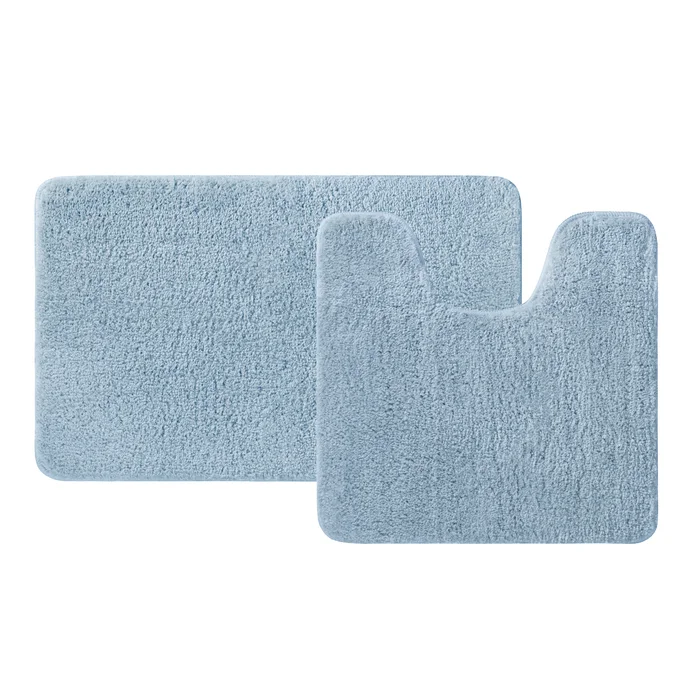 Набор из двух мягких ковриков для ванной светло-синего цвета с плотным высоким ворсом (2 см), очень приятных на ощупь. Стриженый ворс из микрофибры отлично держит форму, легко чистится и быстро сохнет. Коврики предназначены для ванной и для туалета (маленький коврик имеет вырез под унитаз).