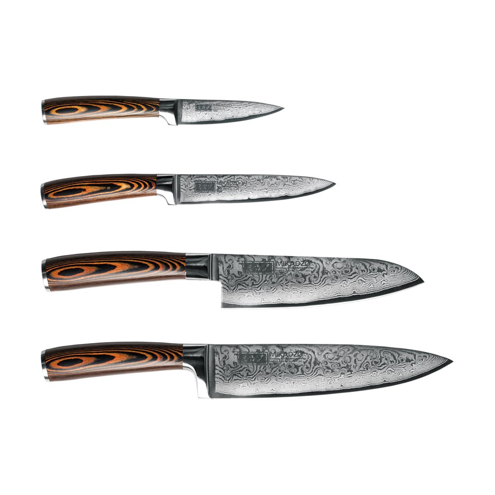 по шкале Роквелла). Уникальная твердость дамасской стали, полная коррозионная устойчивость и безупречная острота лезвий — те преимущества, которые особенно ценятся в ножах коллекций DAMASCUS SUMINAGASHI. Лезвие спроектировано и изготовлено с учетом особенностей японской и европейской культуры резки, что позволяет добиться особого удобства при использовании ножа. Наряду с высокими техническими показателями эффективности, все ножи MIKADZO имеют уникальный дизайн лезвий и рукояток. Для отделки рукояток ножей DAMASCUS SUMINAGASHI применяется пакка — ламинат, состоящий из ценной древесины, пропитанной смолой,