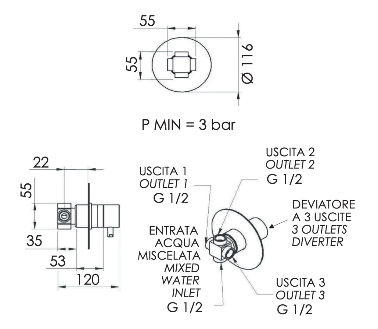 Переключатель потоков Remer X Style N93DEV3NO на 3 выхода, черный матовый
