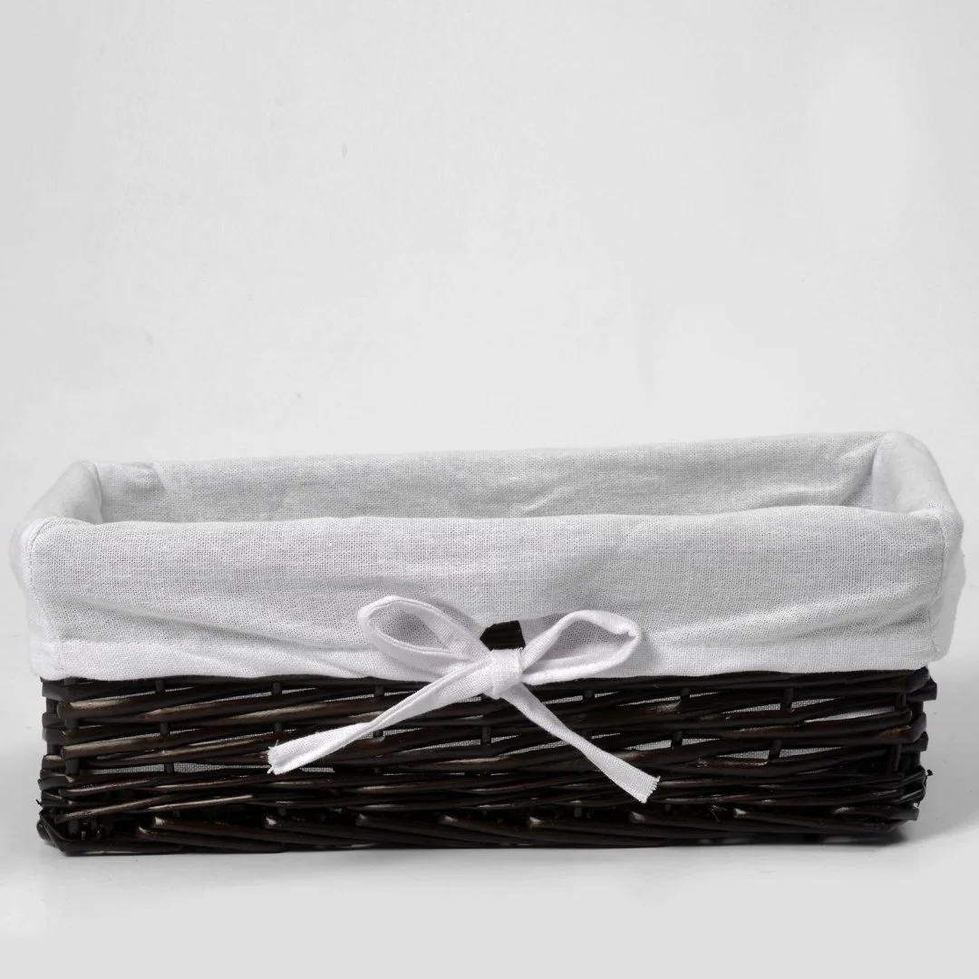 Назначение: Плетеная корзина. Материал: Прутья ивы, текстиль. Покрытие: Водоотталкивающее покрытие. Описание: Размер: 42 х 25 х 14 см* Съемный чехол можно стирать в машинке при температуре не выше 60 градусов.