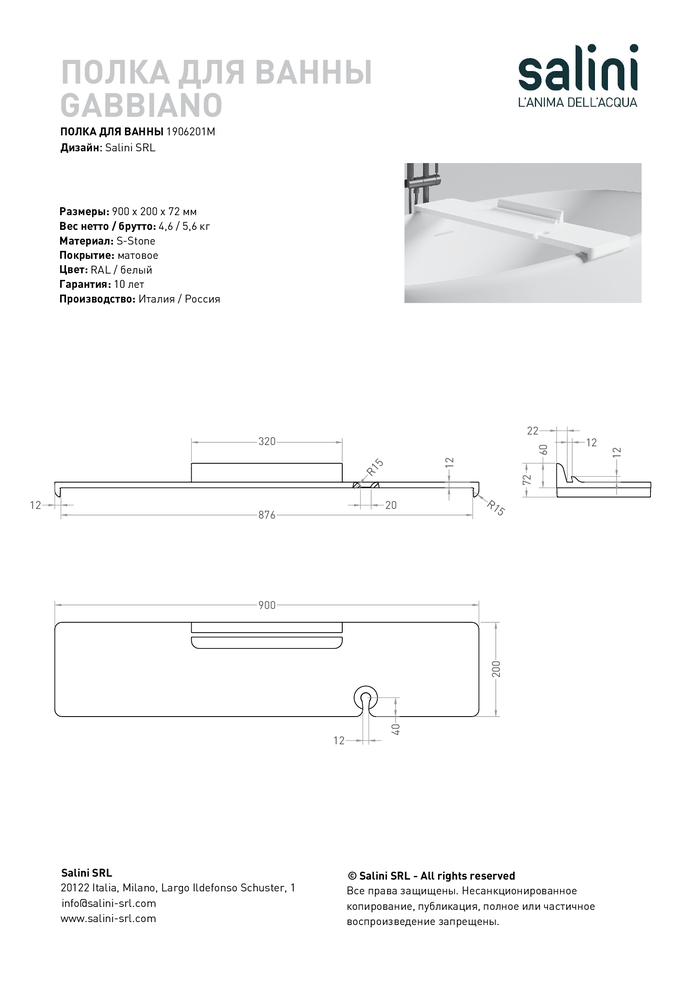 Выполненная из премиального материала S-Stone, модель GABBIANO IN обладает монолитной структурой по всей толщине. Специальные боковые вырезы обеспечивают надёжную фиксацию изделия на бортах ванны, а матовая поверхность предотвращает случайное скольжение предметов на полке. Безупречно ровная плоскость модели облегчает её содержание в чистоте.
