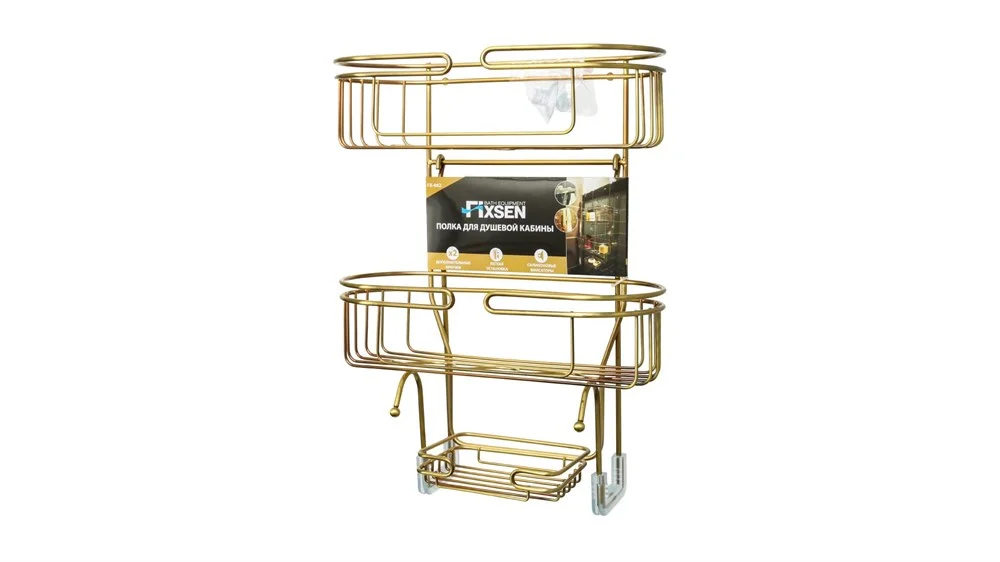 Трёхъярусная полочка-решётка для душевой кабины. Две полочки овальной формы и мыльница, два крючка. Вешается на стекло душевой кабины или уголка. Материал - сталь, окрашенная под бронзу.