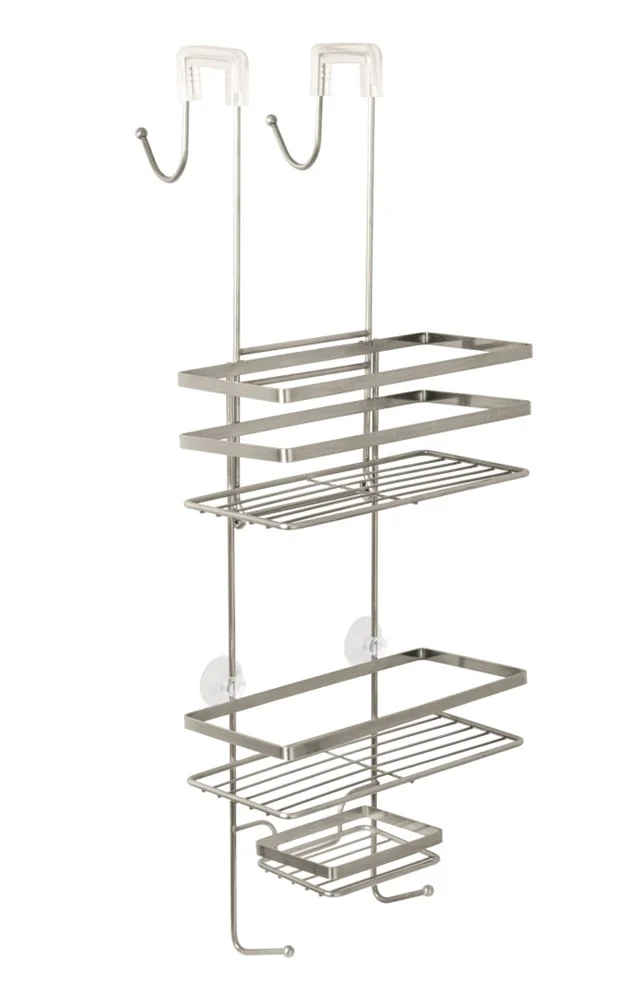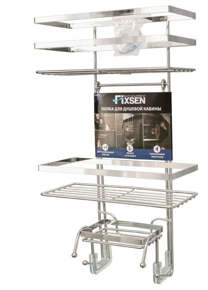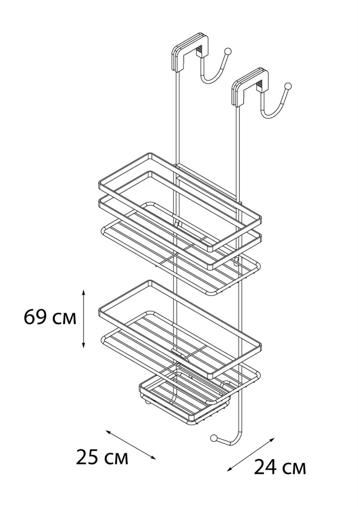 Трёхъярусная полочка-решётка с крючками для душевой кабины или душевого уголка. Вешается на стекло и дополнительно фиксируется присосками к стеклу. Материал - хромированная сталь.