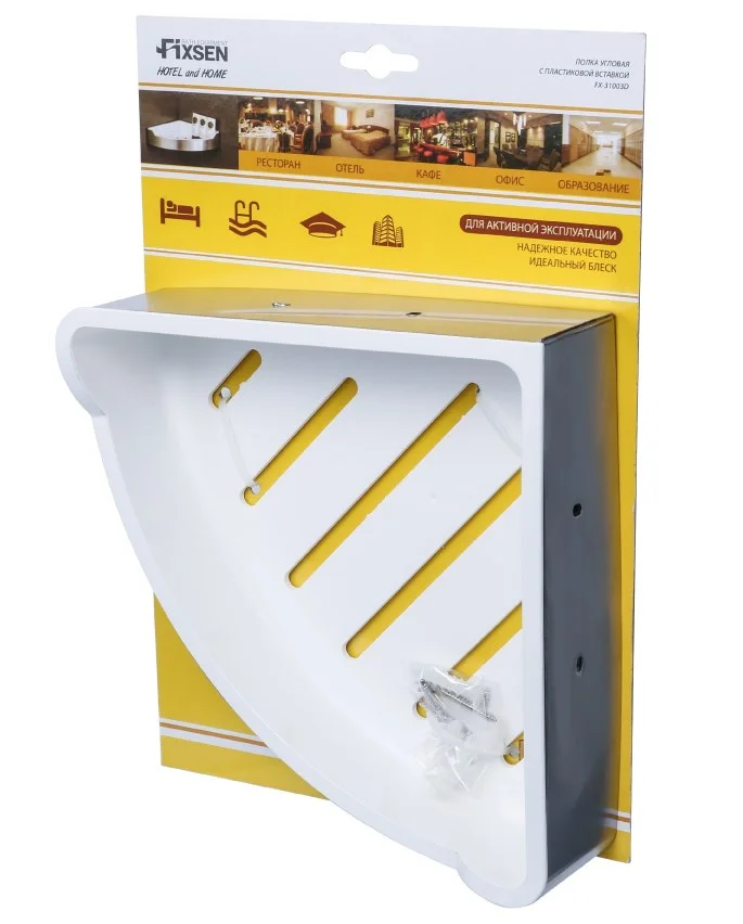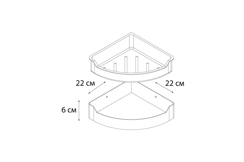 Настенная угловая полочка для банных принадлежностей со съёмной пластиковой вставкой. Материалы - нержавеющая сталь, АБС-пластик.