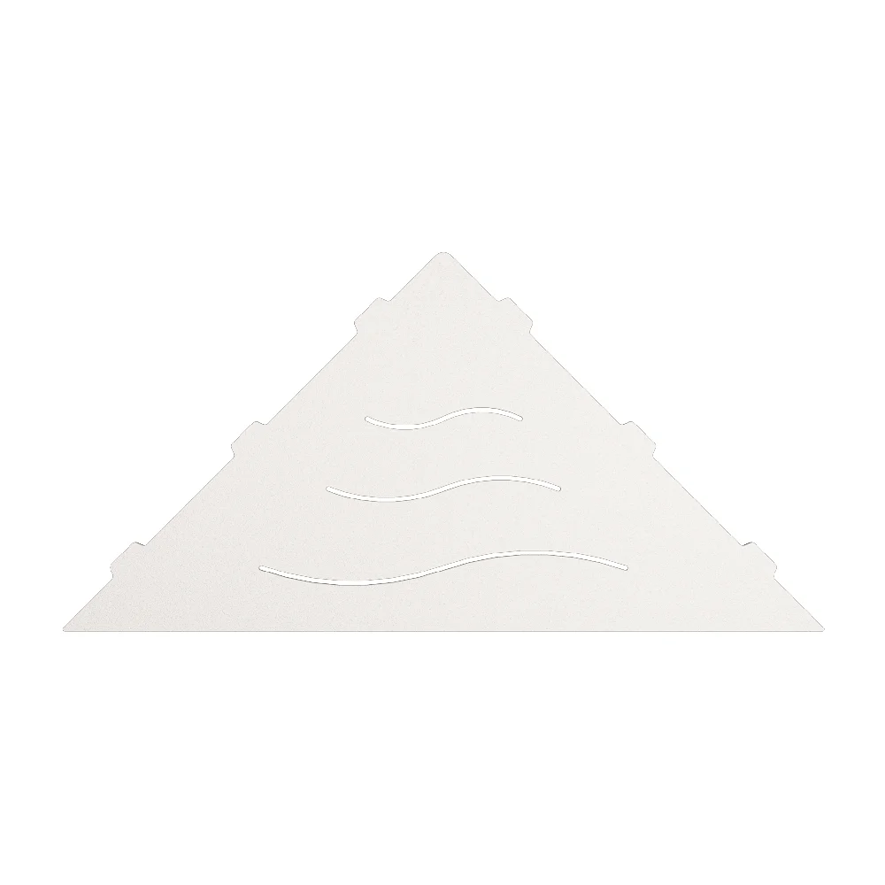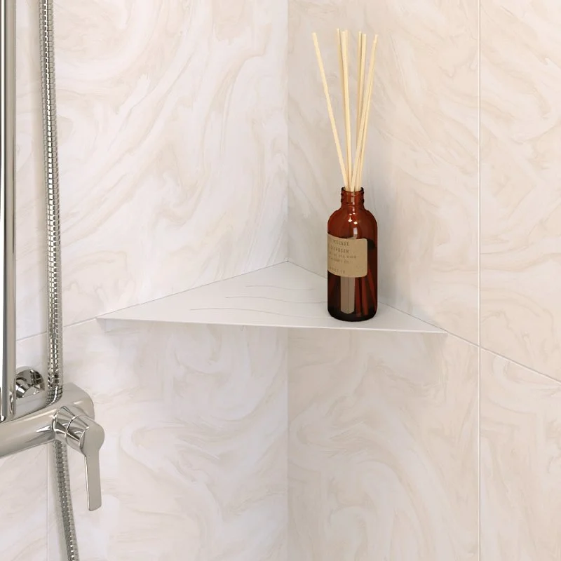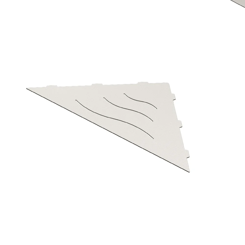 Полки для душевой зоны, разработанные специально для монтажа после завершения ремонта, т. е. укладки плитки. Легко устанавливаются в любые угловые зоны в помещении, для этого прорезается шов между плитками, далее полочка вклеивается между плиткой на любой бытовой герметик.