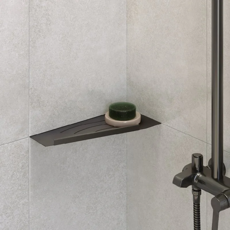 Полки для душевой зоны, разработанные специально для монтажа после завершения ремонта, т. е. укладки плитки. Легко устанавливаются в любые угловые зоны в помещении, для этого прорезается шов между плитками, далее полочка вклеивается между плиткой на любой бытовой герметик.