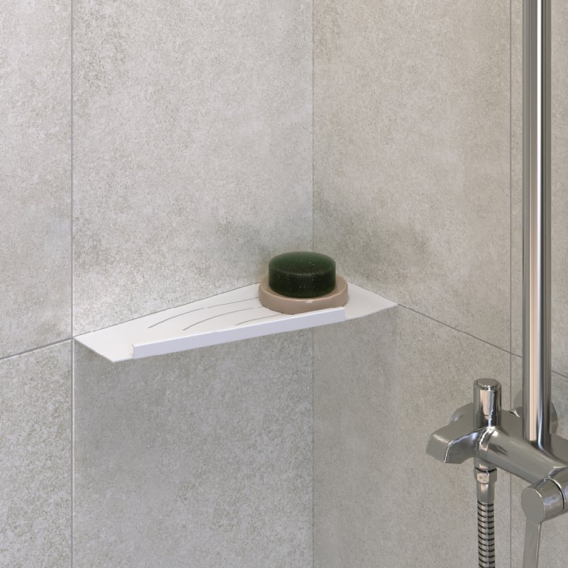Полки для душевой зоны, разработанные специально для монтажа после завершения ремонта, т. е. укладки плитки. Легко устанавливаются в любые угловые зоны в помещении, для этого прорезается шов между плитками, далее полочка вклеивается между плиткой на любой бытовой герметик.