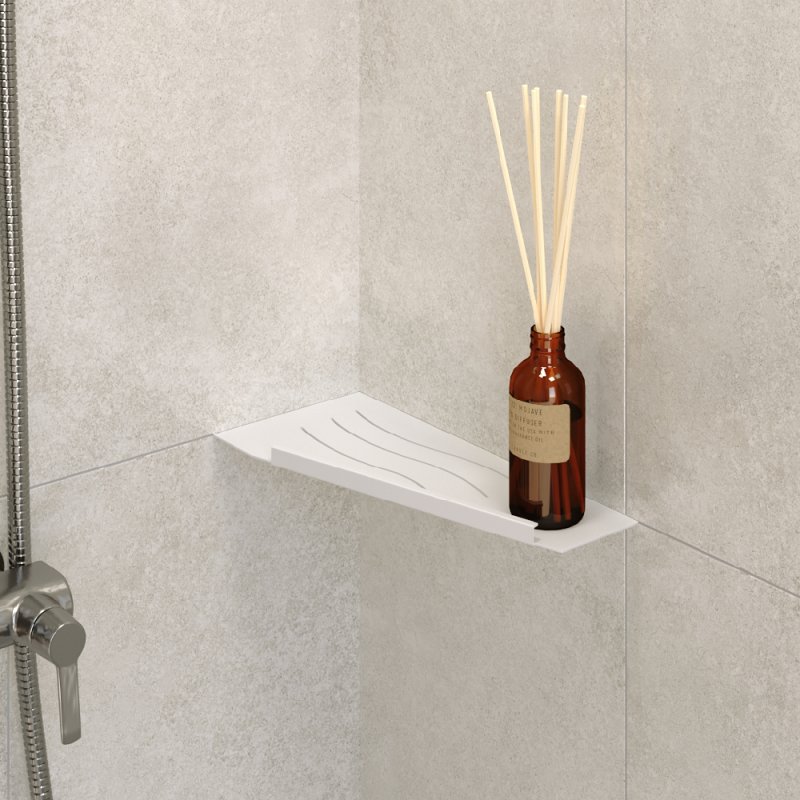 Полки для душевой зоны, разработанные специально для монтажа после завершения ремонта, т. е. укладки плитки. Легко устанавливаются в любые угловые зоны в помещении, для этого прорезается шов между плитками, далее полочка вклеивается между плиткой на любой бытовой герметик.