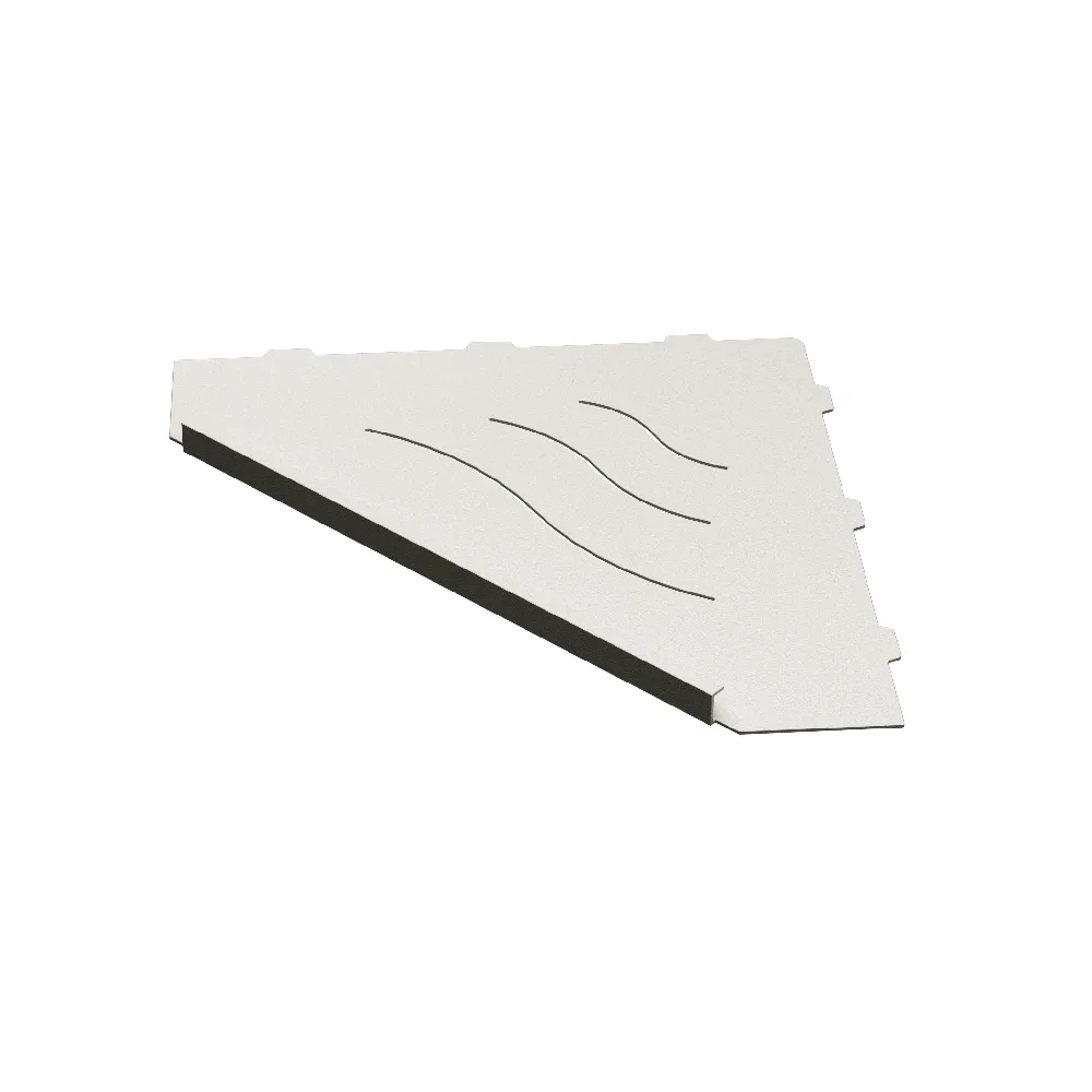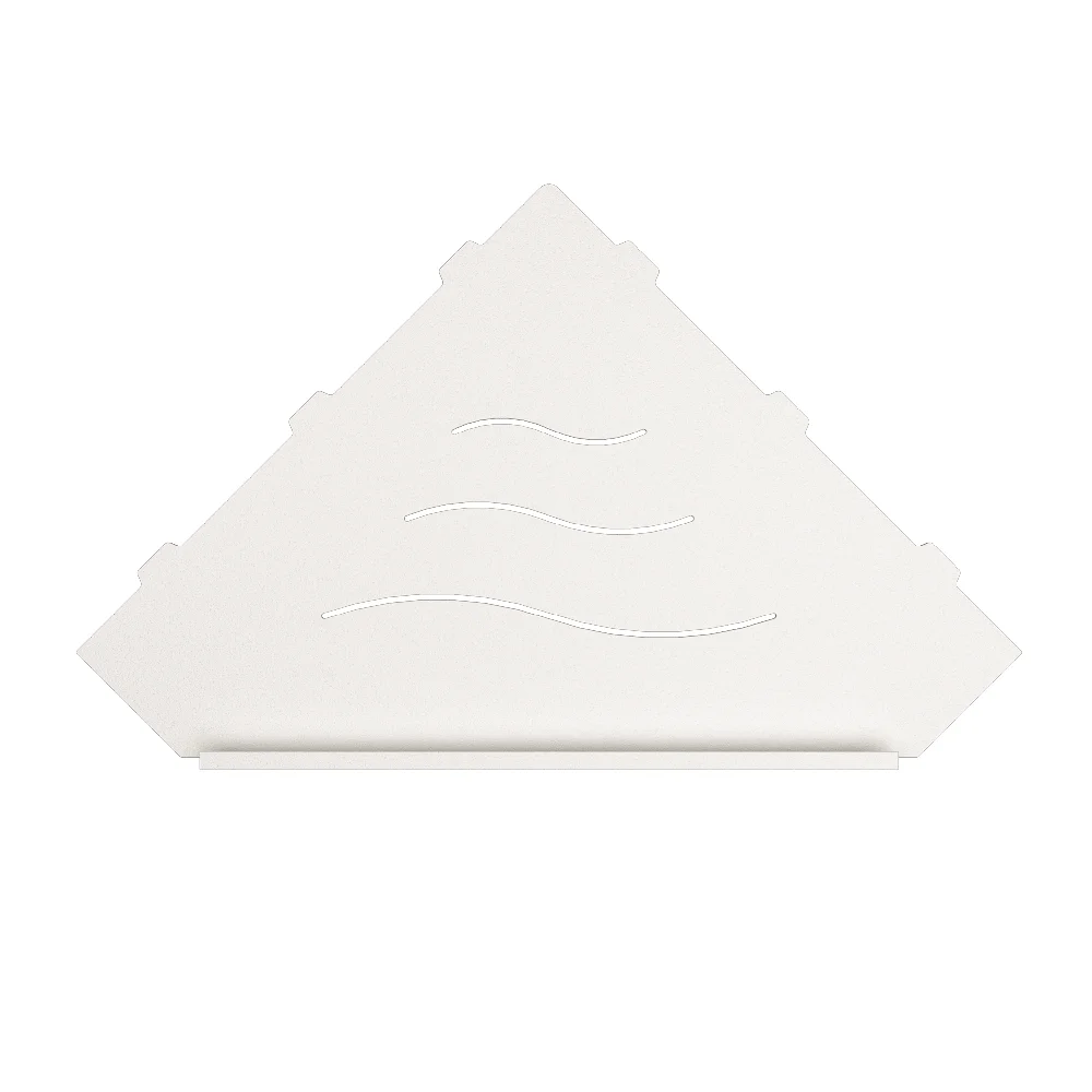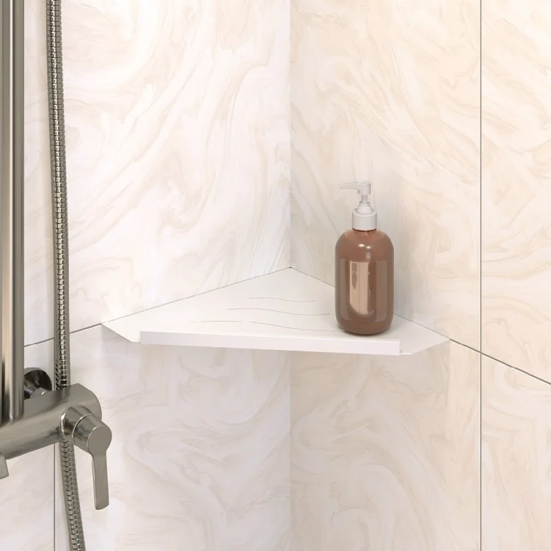 Полки для душевой зоны, разработанные специально для монтажа после завершения ремонта, т. е. укладки плитки. Легко устанавливаются в любые угловые зоны в помещении, для этого прорезается шов между плитками, далее полочка вклеивается между плиткой на любой бытовой герметик.