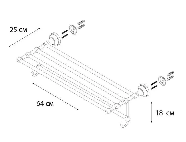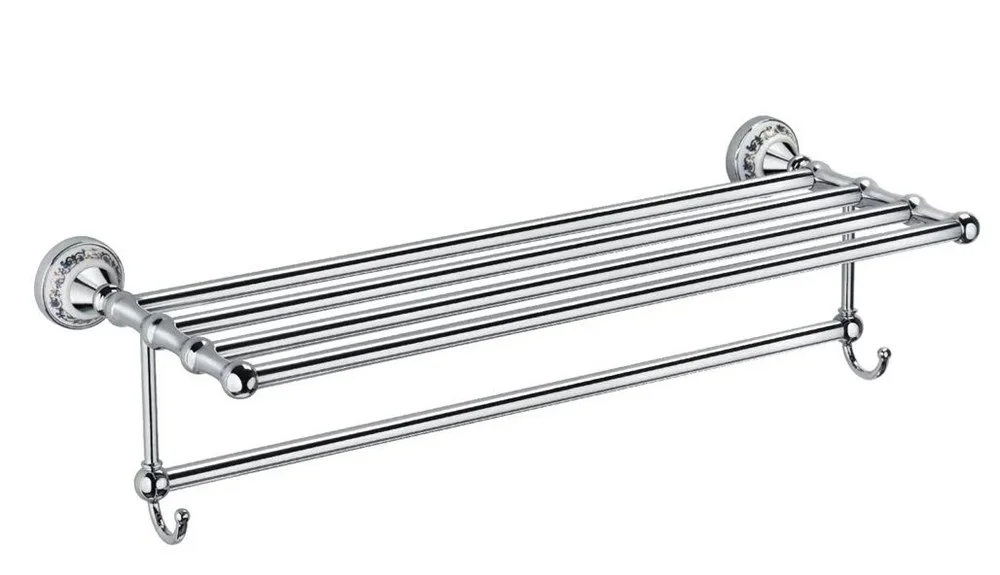 Настенная полочка для банных полотенец с полотенцедержателем и крючками. Материал - хромированная латунь.