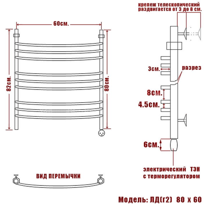 Полотенцесушитель электрический Ника ARC ЛД (Г2) 80/60 правый тэн