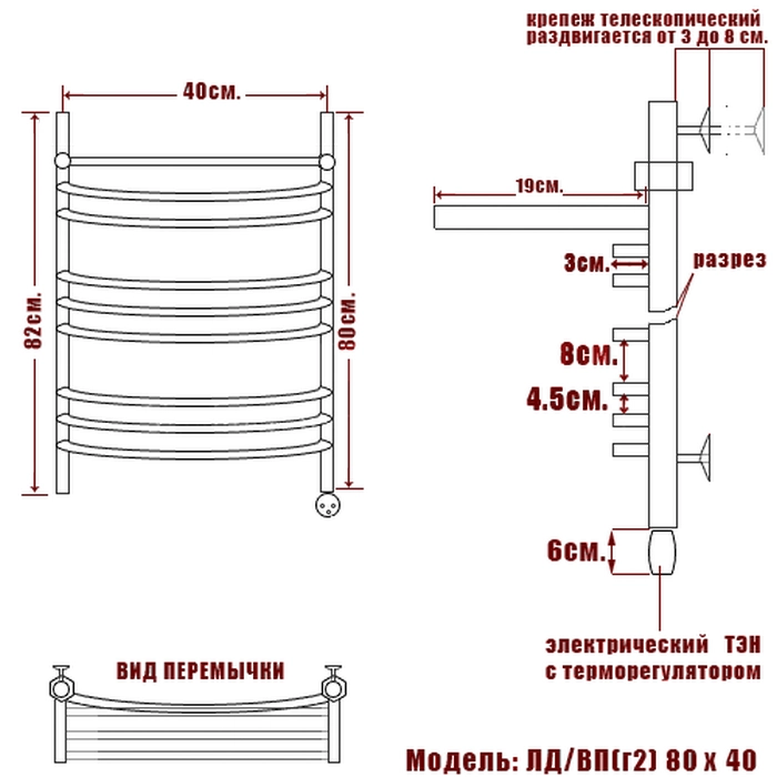 Полотенцесушитель электрический Ника ARC ЛД (Г2) ВП 80/40 правый тэн