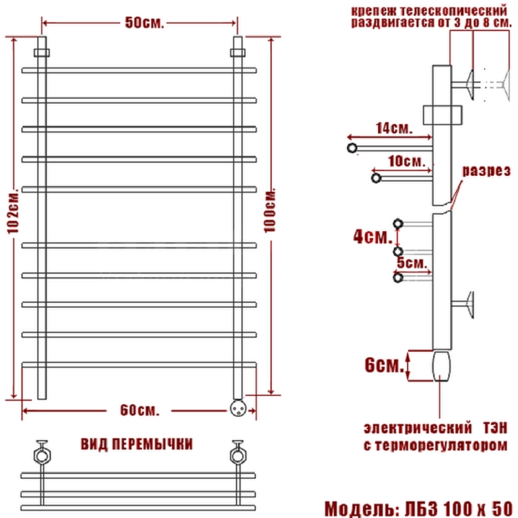 ЛБ3 – электрический полотенцесушитель без полки, но каждая горизонтальная перемычка выдвинута вперед больше предыдущей. Таким образом, верхняя перемычка, фактически, превращена в аналог полочки, так как она выступает вперед на 14,5см.